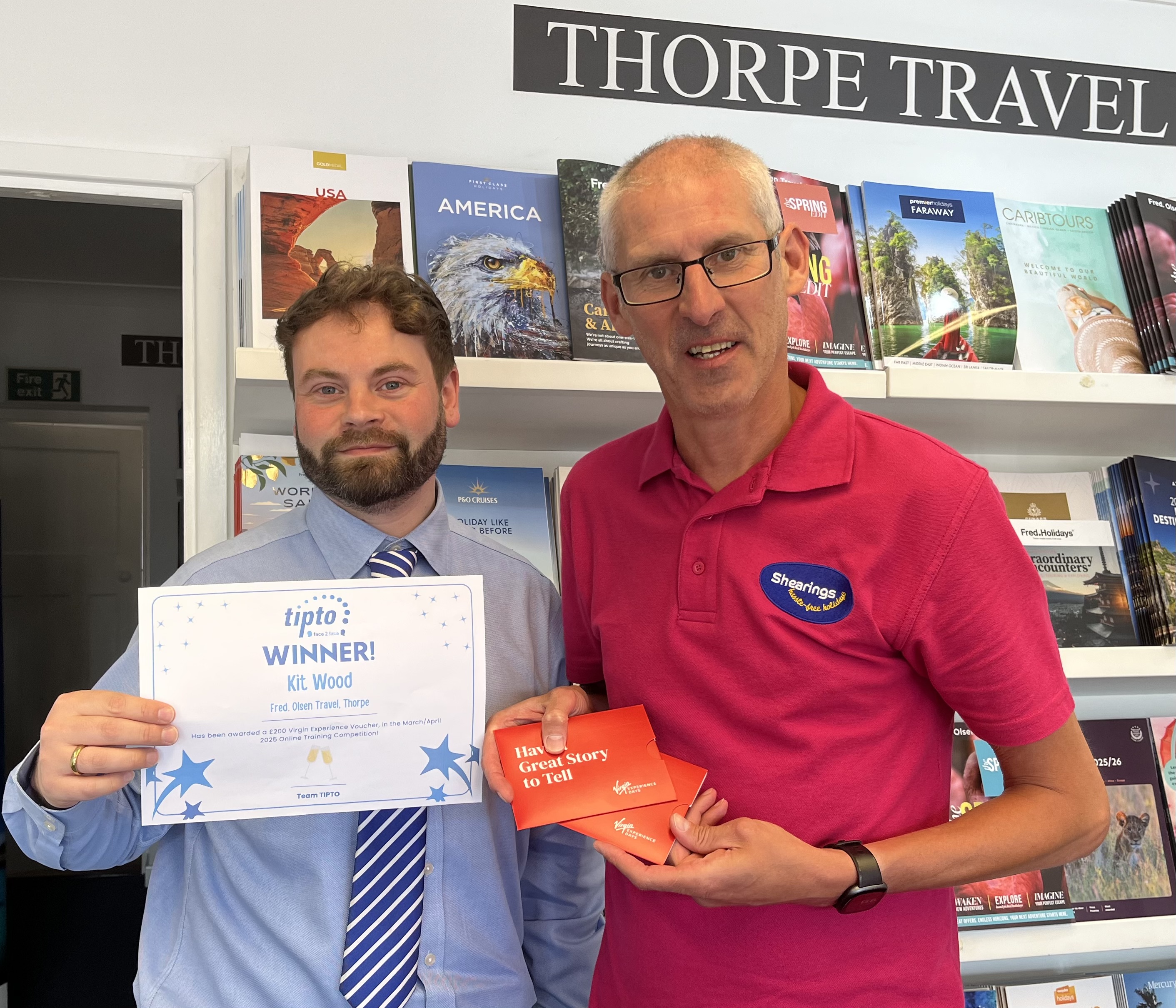 Kit Wood from Fred. Olsen Travel Agency! Pictured here receiving his prize from Ashley at Leger Shearings Holidays!