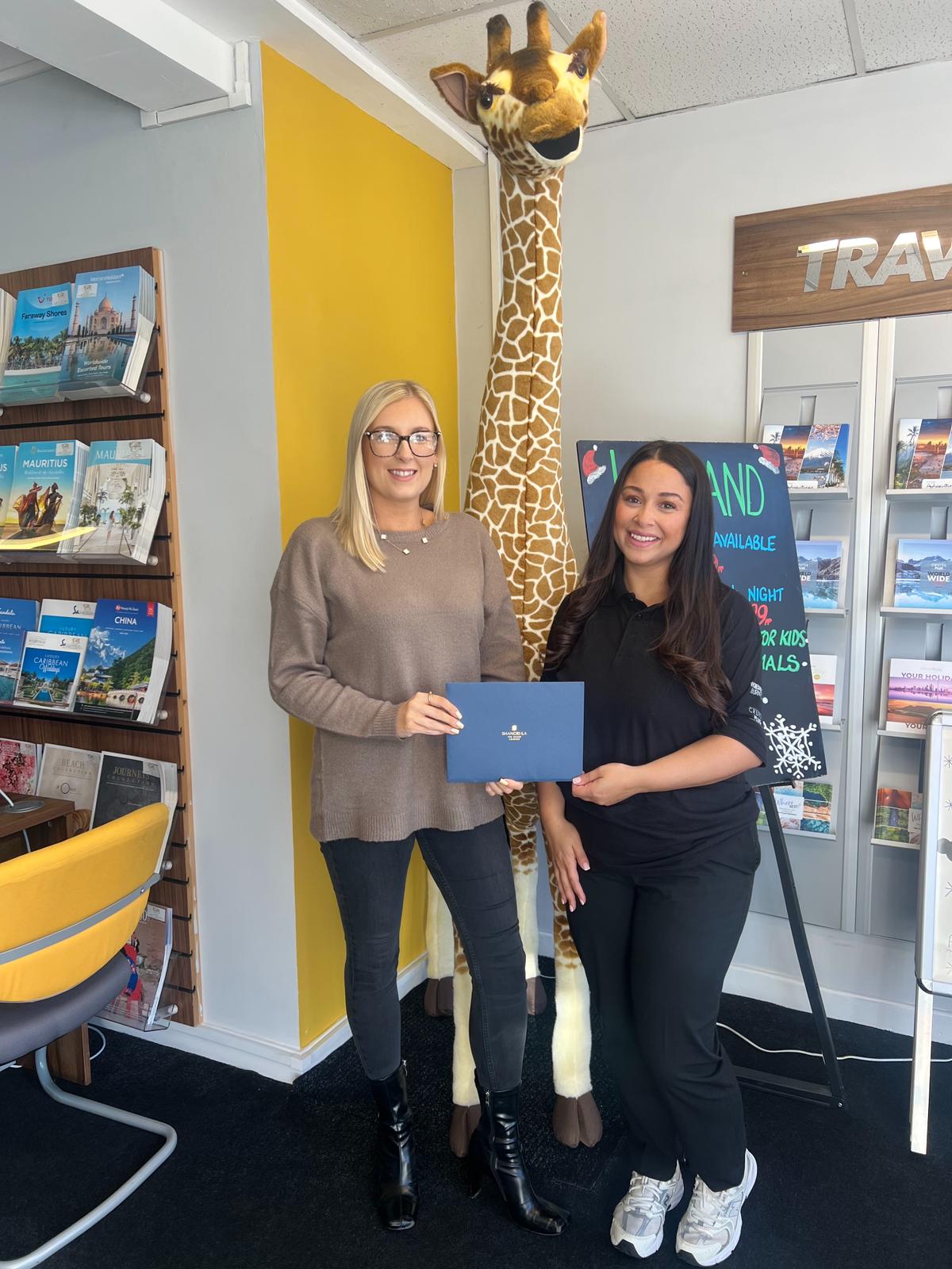 Vanessa is pictured (right) receiving her prize from Nicky Bird from Red Sea Holidays (left)!